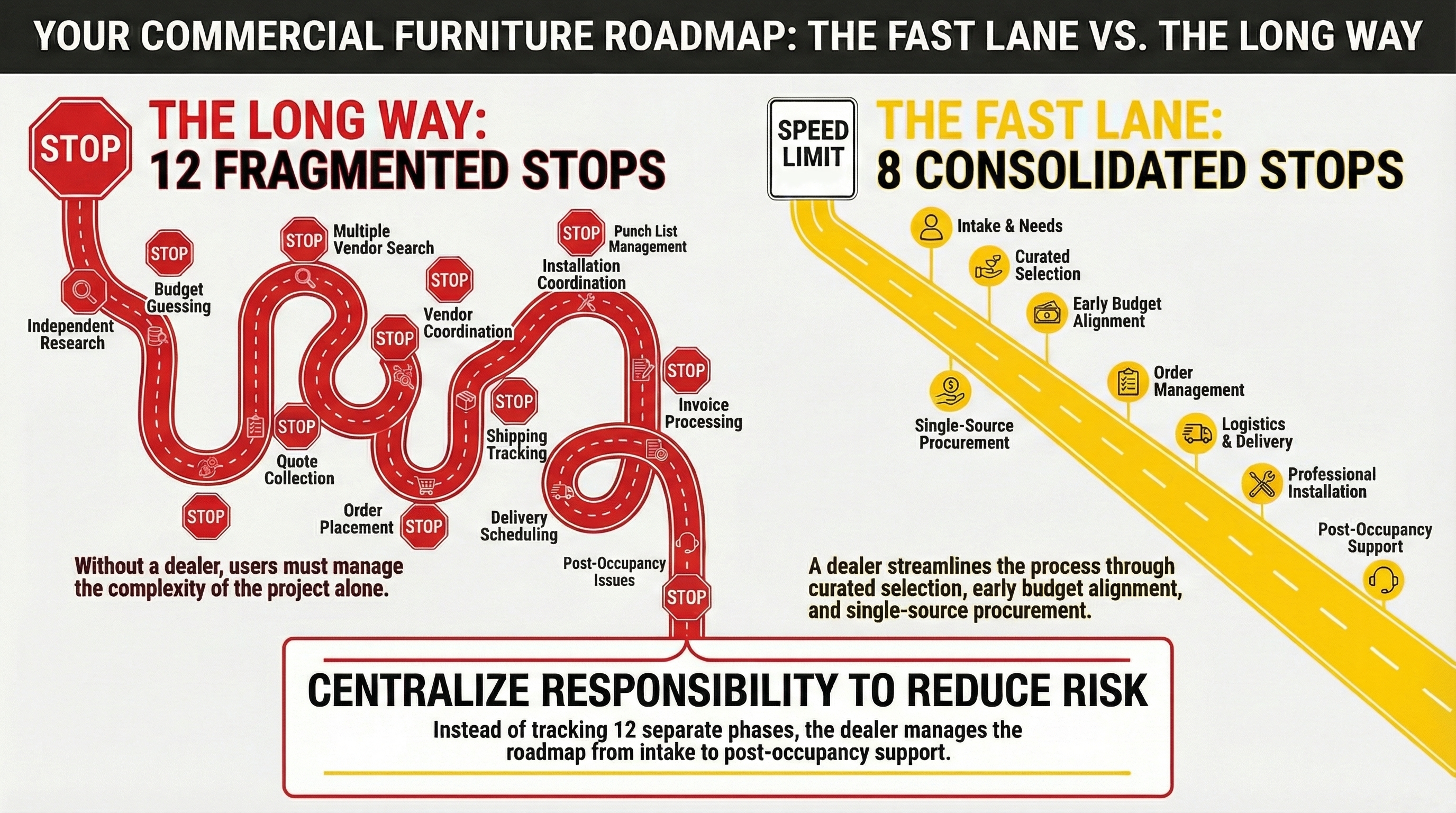 The relationship doesn't end when the furniture is installed or the architectural products are in place. Dealers provide warranty support, product maintenance guidance, and serve as your single point of contact for future projects. They've built their reputation on making your projects run smoothly—and that's what 20+ years in this business gets you.